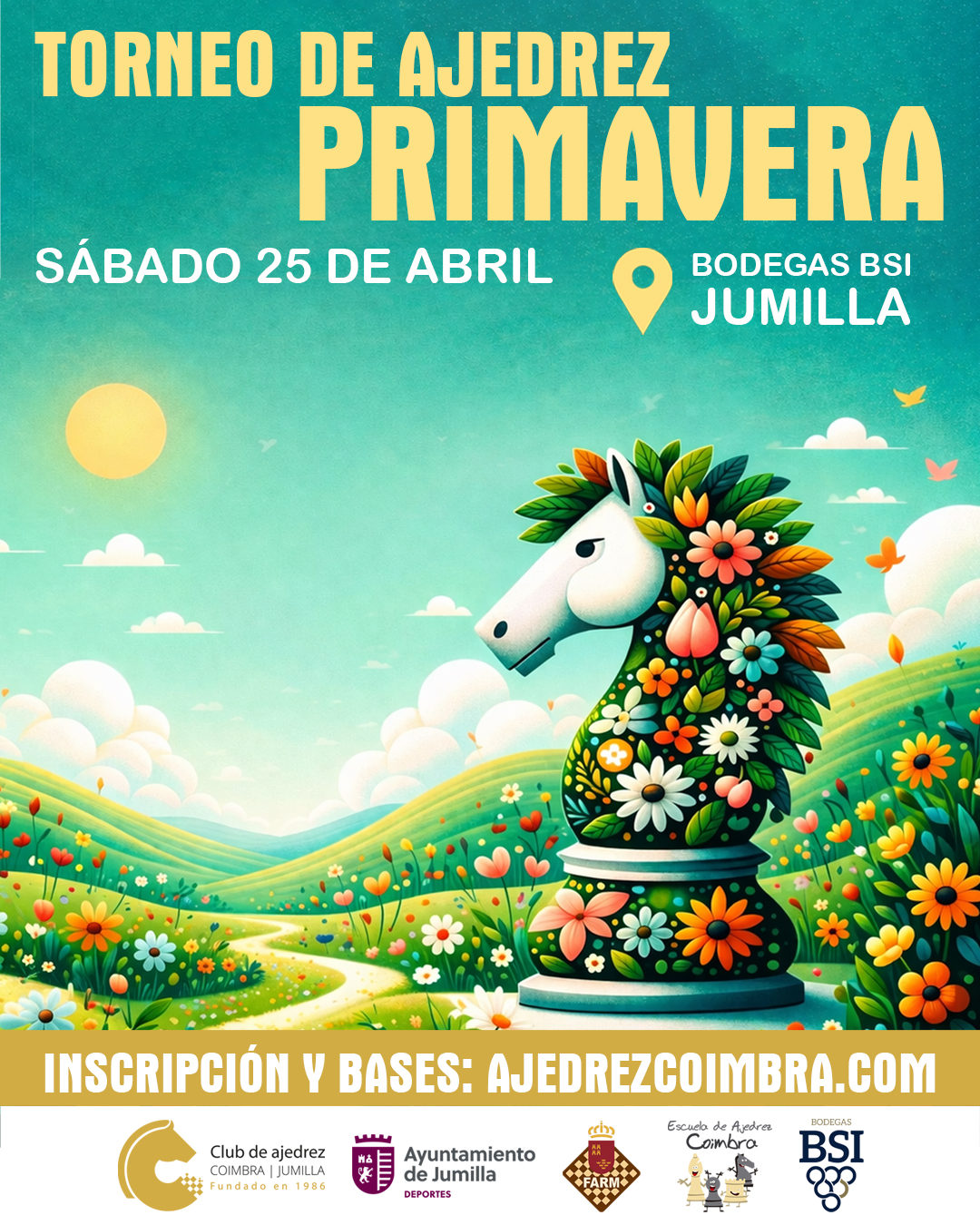 El próximo sábado 25 de abril de 2026, el Club de Ajedrez Coimbra de Jumilla, en colaboración con la Concejalía de Deportes del Excmo. Ayuntamiento de Jumilla, la Federación de Ajedrez de la Región de Murcia (FARM), van a organizar el Torneo de Ajedrez «Primavera 2026».